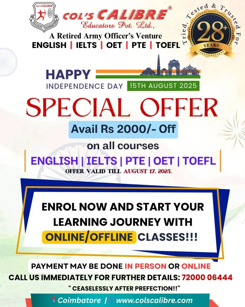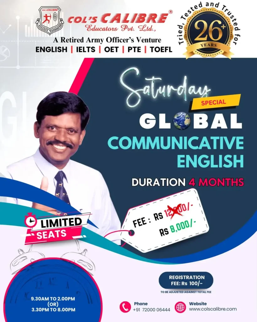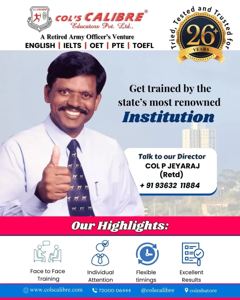 Hello everyone! I'm Ajay Karthick, and I recently completed my IELTS training at Col’s Calibre Educators, in which I was able to improve my grammar and enhance my knowledge in English with the proper training provided by the training center.Moreover, the training provided by the trainers as well as the director Col. Jeyaraj, himself, helped me a lot to gain my required band in IELTS exam.
